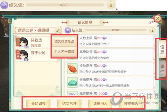 5、小伙伴们在结义后如果想发起“长幼调换、结义合并、请离旧人、接纳新人、介意称谓修改、个人名号修改“操作,均可在结义信息界面点击右侧的”信息和事件“按钮查看和操作。