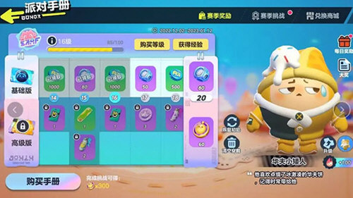 5、在蛋仔派对游戏中,点开派对手册,会发现它还分为基础板和高级款的。在高级款中,每升十级就会送六十个蛋币。众所周知,派对手册每个赛季一共有50级的奖励可以领取,肝完整个手册就有300个蛋币。