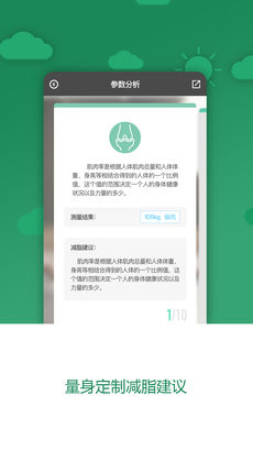 该软件会收集你的健康数据,包括体重、体脂率、水分、肌肉率、身体年龄、身高、蛋白质率等数据,让你了解自己的肥胖程度;系统会根据你的基础信息为你进行健康分析和提供减脂建议,还会为你推荐该吃的食物和运动量,让你科学的减肥;该软件也会随时记录你的体脂率和BMI指数,还可以查看历史测量的数据,为你生成健康报告,让你详细了解自己的身体状况;你可以根据系统的建议制定减脂计划,按照时间来规定吃的食物和运动,你还可以在教练中心寻找合适的教练,为你定制减脂计划。