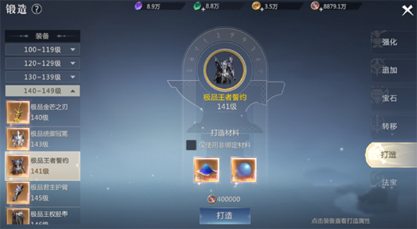 多看基础的,通过经验等其他素材提升自己的等级变强以外。玩家们还可以使用老生常谈但却经典有用的装备系统来提升自己的属性。游戏中有着较为成熟的装备打造系统,玩家们可以通过收集不同的稀有材料,通过锻造界面进入,不然也可以前往相应的城池找锻造师NPC进行锻造。