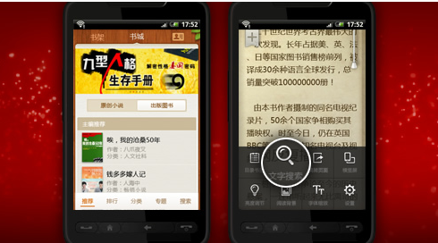 海量书城在线资源:免费电子书,热门的小说杂志应有尽有;热门推荐,专业作者的每日连载更新。在全平台支持多种格式:Symbian /iPhone /Android/ Kjava多平台想用就能用;TXT、UMD、HTML、EPUB、DOC、XLS、PPT多格式想看就能看.个性化阅读模式,自动断章、自动翻页滚屏、护眼夜间模式、亮度自由调节、自定义快捷键,实现个性贴心的看书体验。